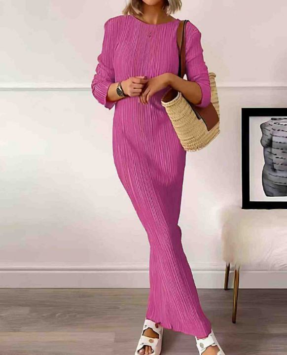 春季新款品牌外贸原单美式三宅弹力褶皱大长款连衣裙,...
