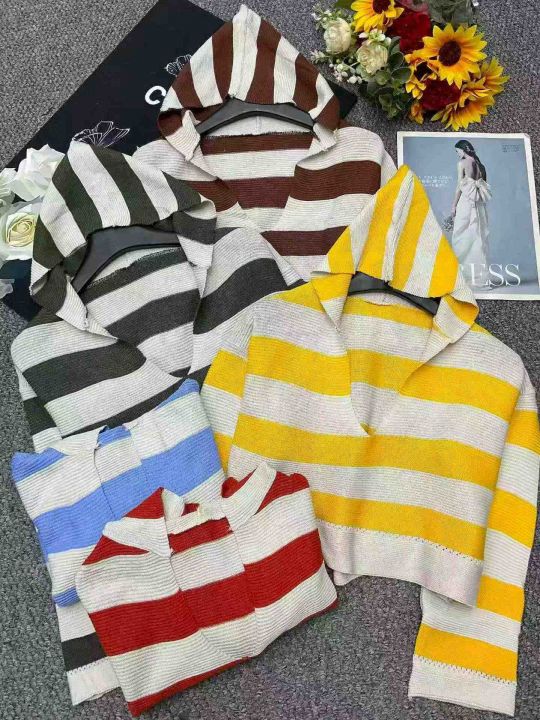 春季新款撞色条纹短款宽松慵懒风连帽针织套头毛衣,独...