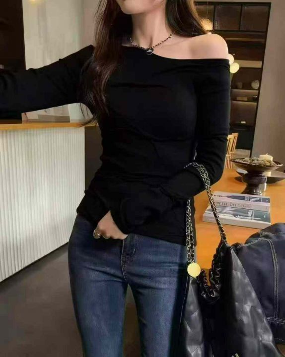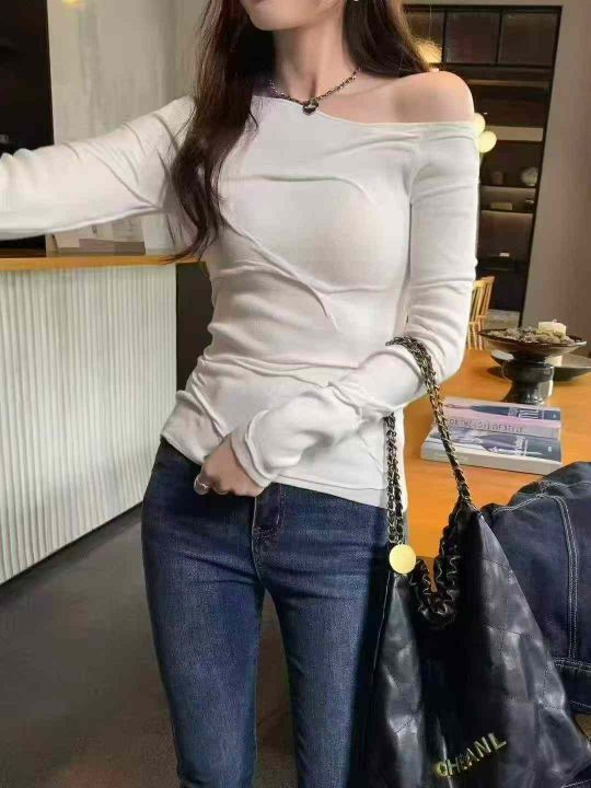 早秋新款纯欲风高级感穿搭气质斜肩长袖包芯纱套头毛衣...