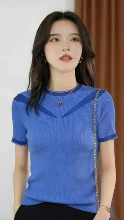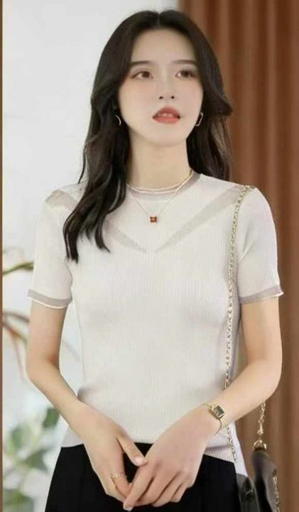 夏季新款蕾丝拼接弹力修身显瘦短袖针织衫,独立包装,...