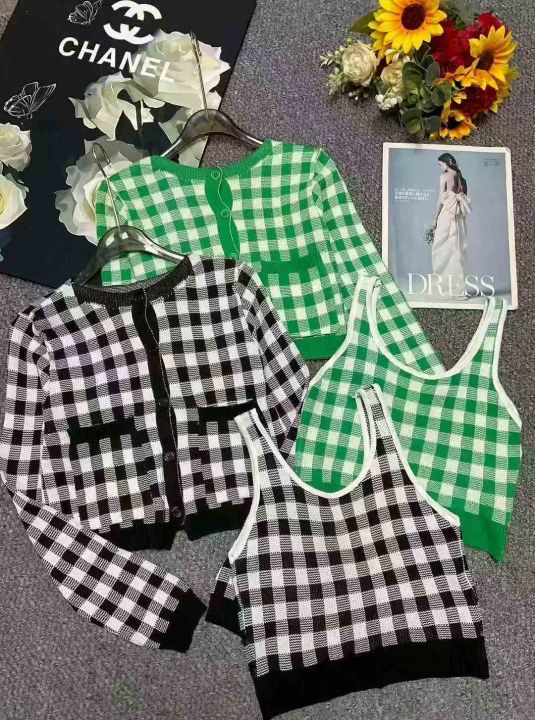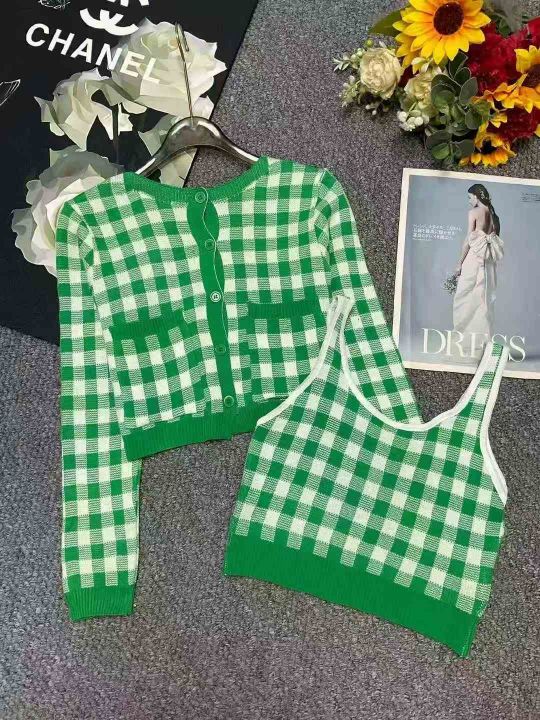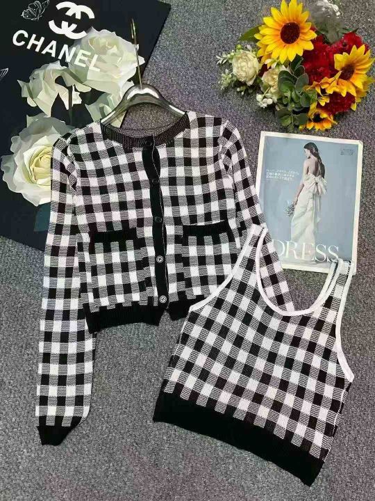 139套小香风棋盘格针织毛衣开衫+针织吊带背心2件套,独立包装,均码