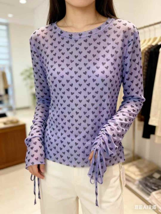 120件冰丝网纱打底衫女夏季薄款防晒罩衫圆领长袖内搭爱心印花蕾丝上衣,尺...