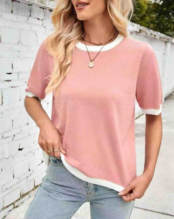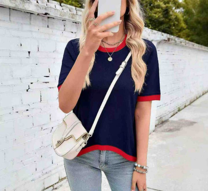 夏季新款品牌原单宽松百搭拼接撞色圆领针织短袖T桖,...