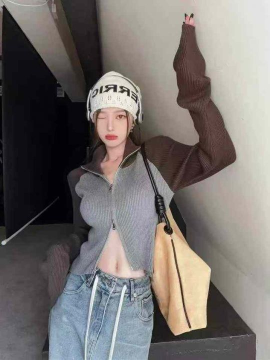 春季新款撞色插肩双头拉链辣妹设计感弹力修身针织毛衣开衫,独立包装,均码...