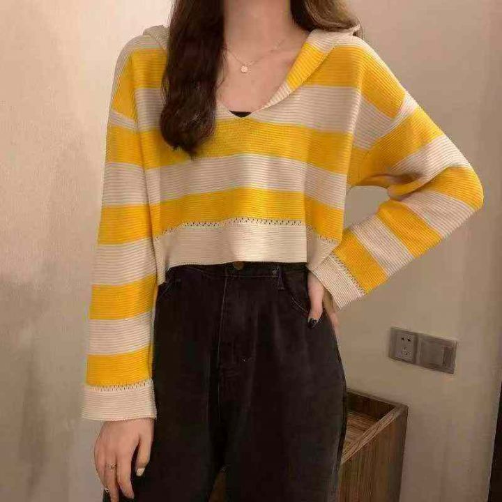 春季新款撞色条纹短款宽松慵懒风连帽针织套头毛衣,独立包装,均码面料柔软...