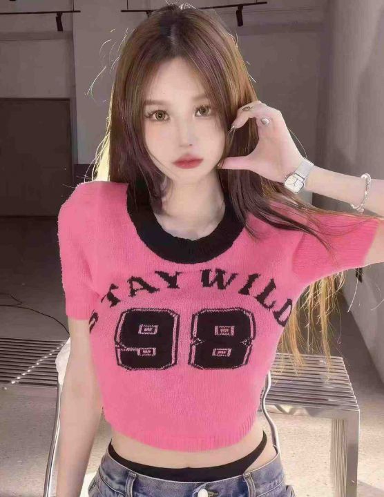 夏季新款辣妹性感短款弹力修身显瘦撞色提花短袖针织衫...