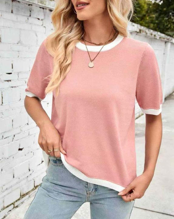 夏季新款品牌原单宽松百搭拼接撞色圆领针织短袖T桖,...