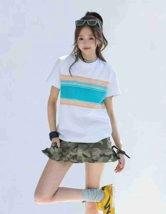 [月亮]:简约条纹拼色休闲纯棉包边短袖