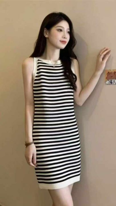 夏季新款撞色条纹韩系冰丝针织吊带连衣裙,独立包装,...