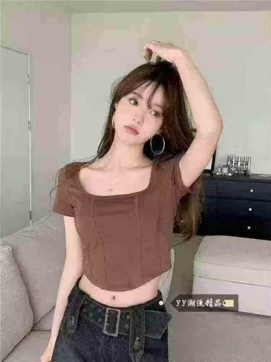 全清价5.9短袖方领T恤露脐修身显瘦设计感短款辣妹上衣,独立包装,码数1-4...