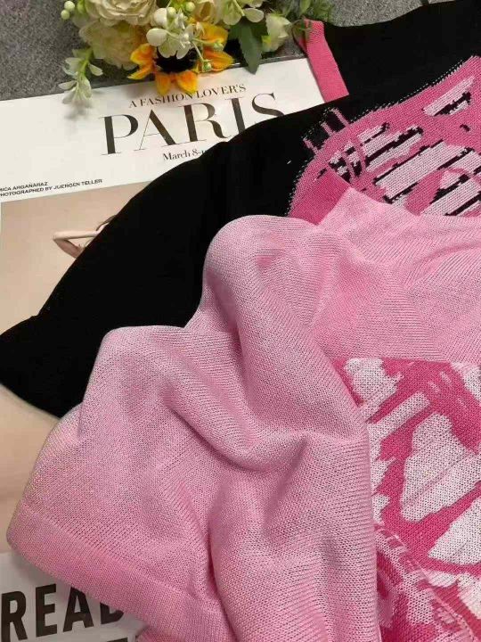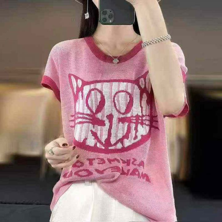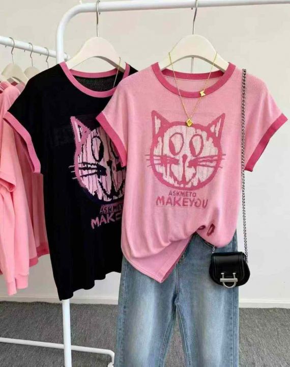 夏季新款时尚设计感拼色猫咪提花宽松慵懒风显瘦落肩针...