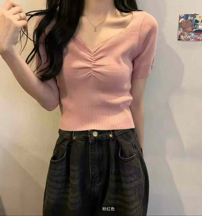 夏季新款网红净版复古设计款韩版V领冰丝针织小衫,独...