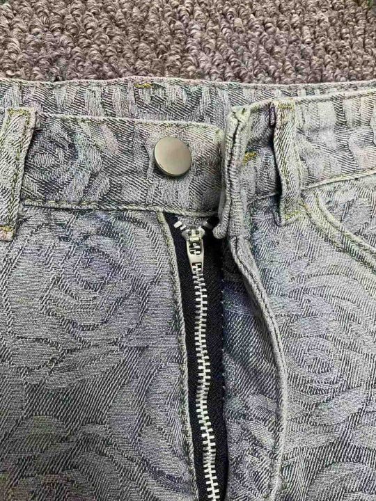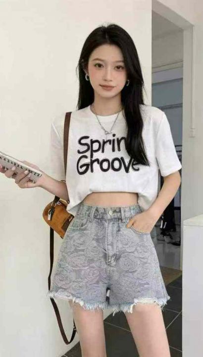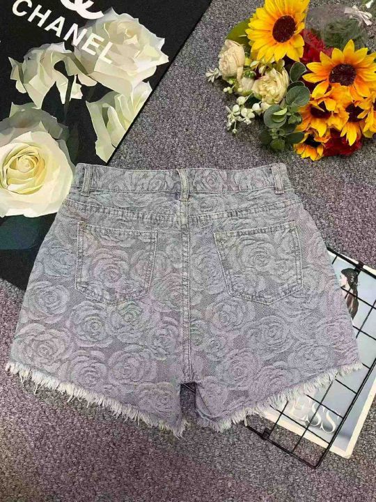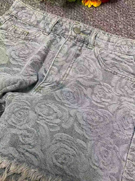 夏季新款洗水棉宽松百搭时尚提花毛边阔腿牛仔短裤,独...