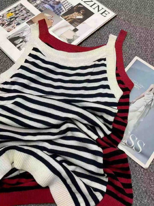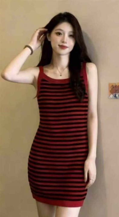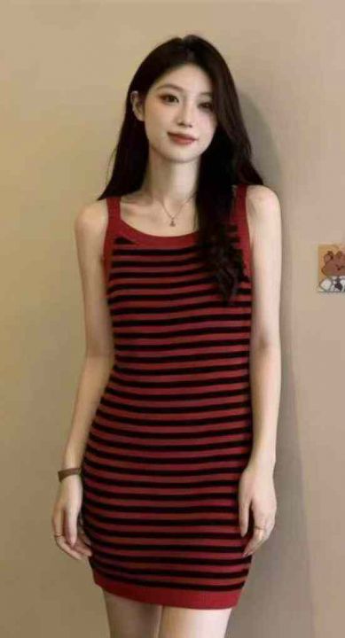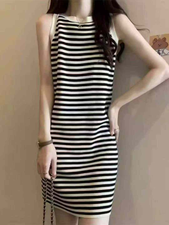 夏季新款撞色条纹韩系冰丝针织吊带连衣裙,独立包装,...