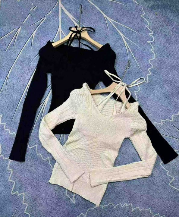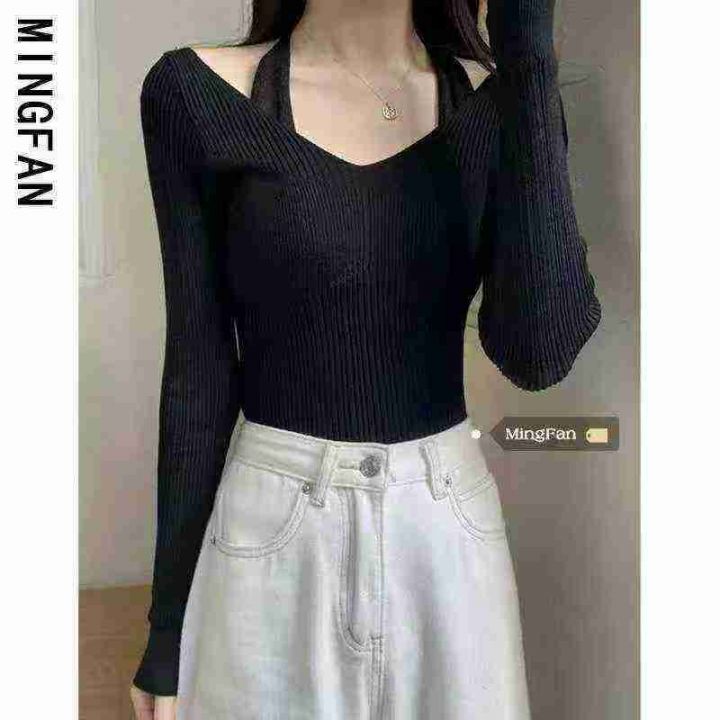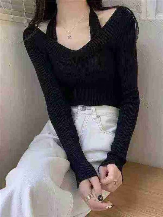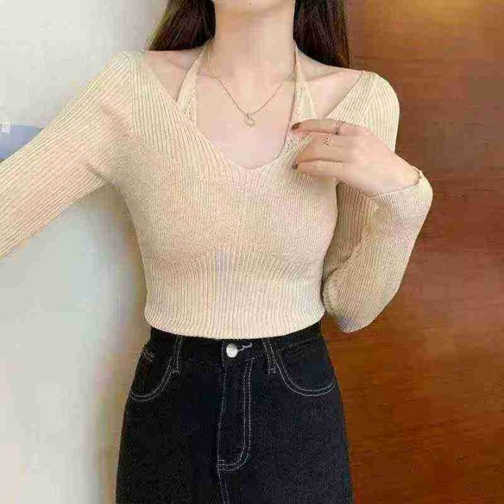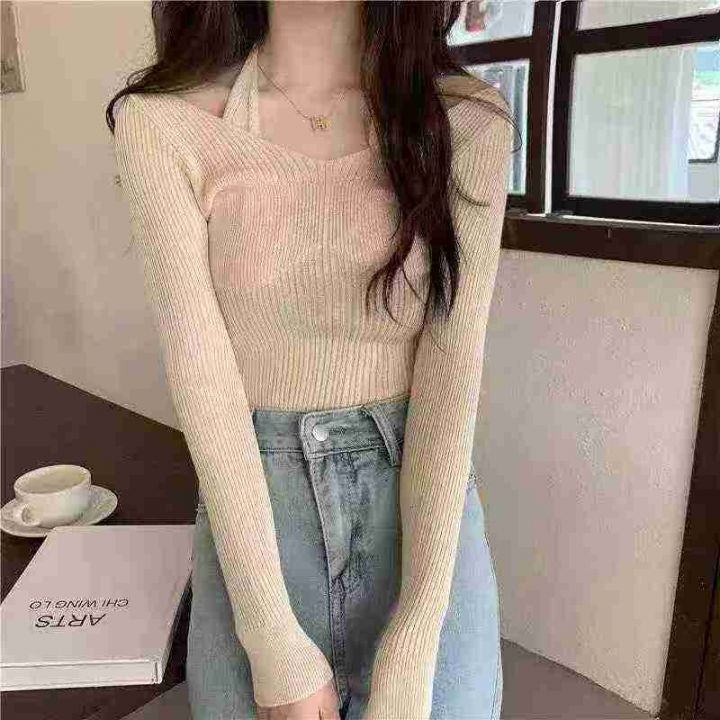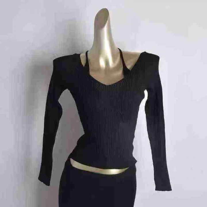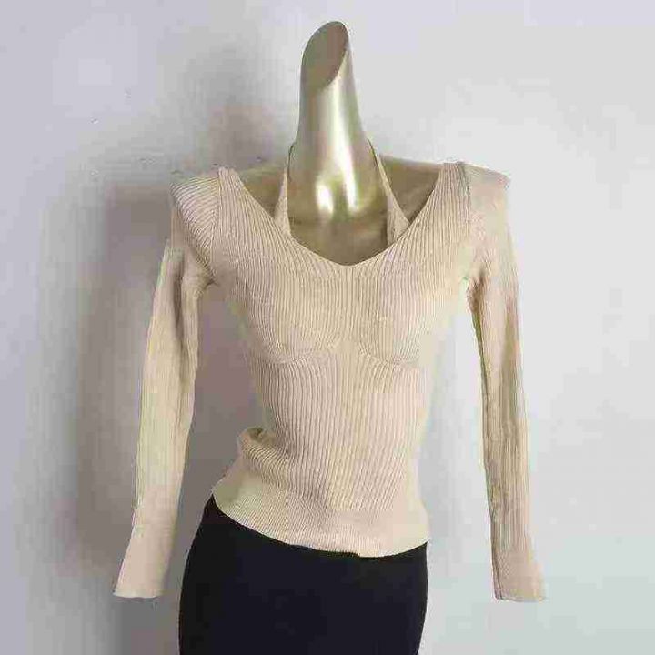 纯欲性感抹胸挂脖假两件长袖针织衫上衣弹力针织衫,独...