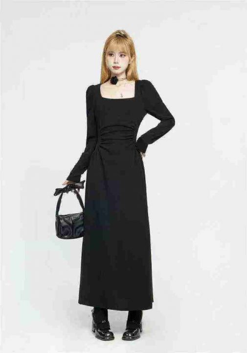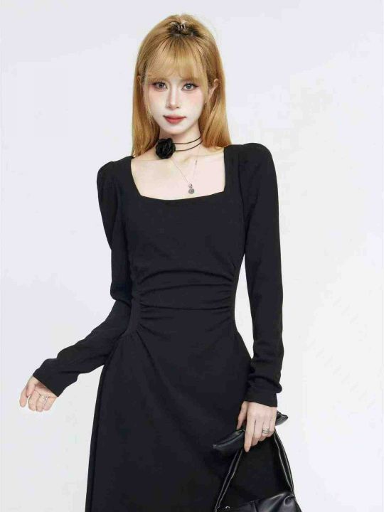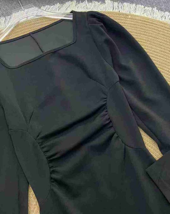 赫本风黑色方领连衣裙63件9.9,面料舒适,褶皱收腰,...