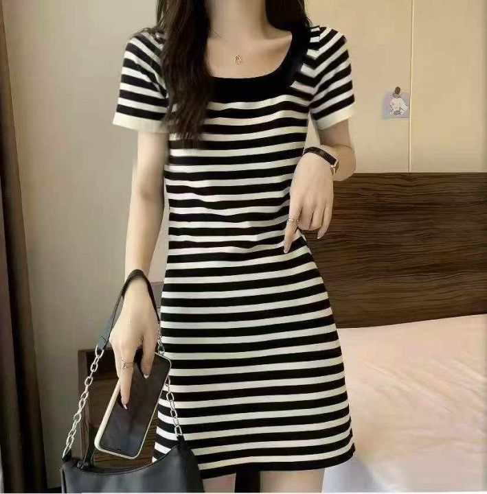 夏季新款撞色法式复古条纹方领短袖t恤针织连衣裙,独...
