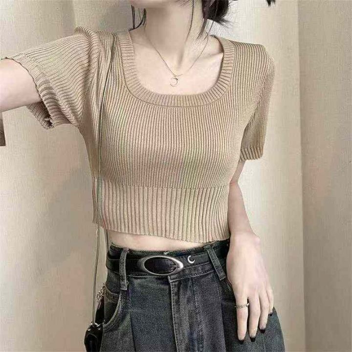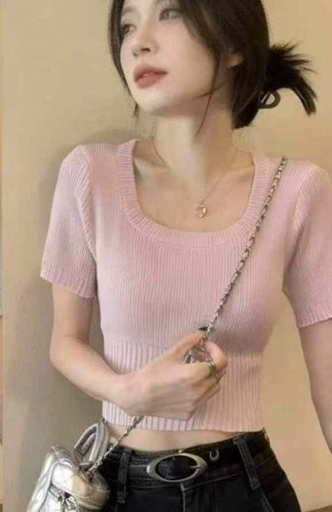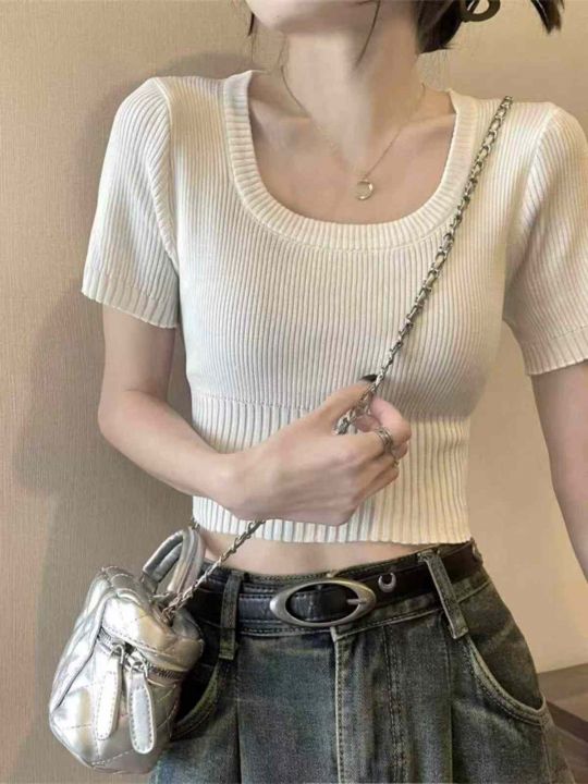 夏季新款冰丝弹力修身显瘦高腰净版简约百搭短袖针织衫...