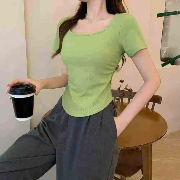 冰丝螺纹纯色U领下摆短袖 356件,全清5.8元,正品独立包装,四个色,码数:M到XL,弧形下摆U领正肩短袖T恤女夏季简约修身显瘦上衣