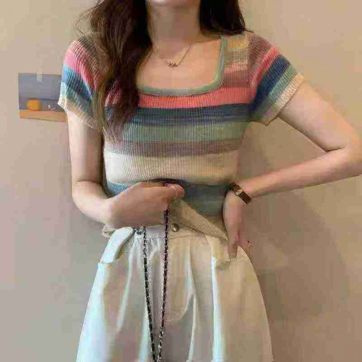 ☕️彩虹条纹方领短袖t恤女冰丝针织短款上衣超好看辣...