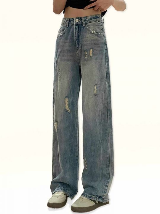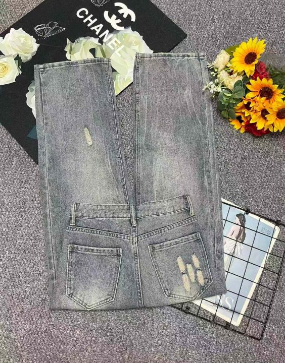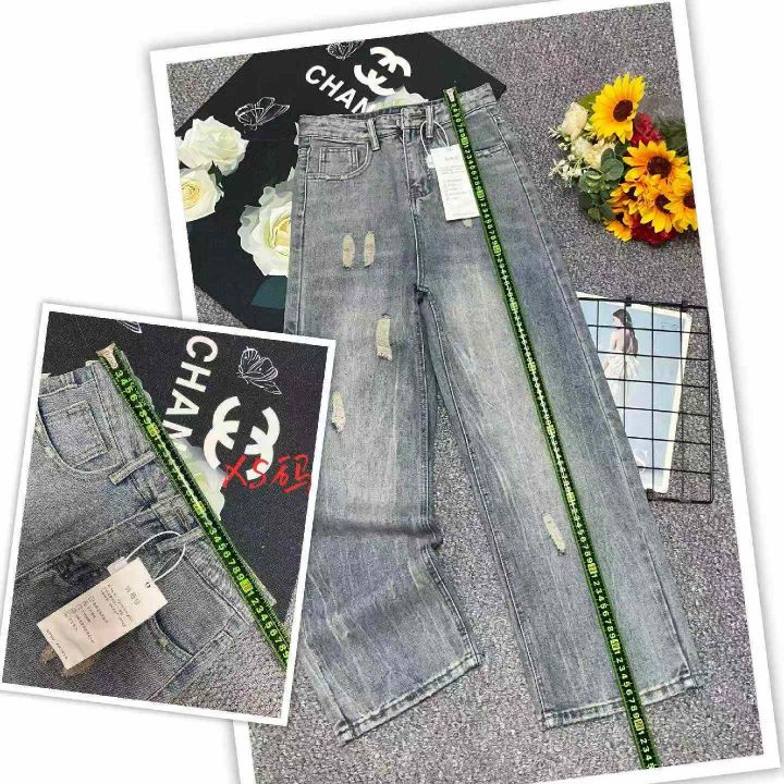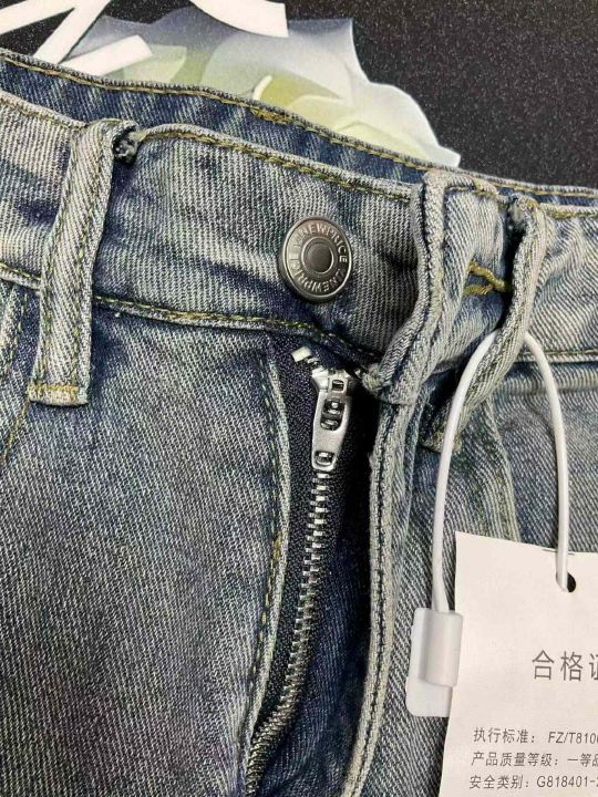 春季新款网红复古洗水棉破洞牛仔直筒阔腿裤,独立包装...