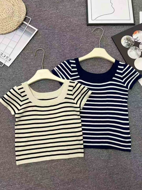 ☕️黑白条纹短袖u领露锁骨针织t恤女夏天薄款高级感正肩冰丝上衣580件全清7.8元 ,分货8.8元,均码高弹力,单款2色,辣妹针织条纹T恤[庆祝][庆祝][庆祝]