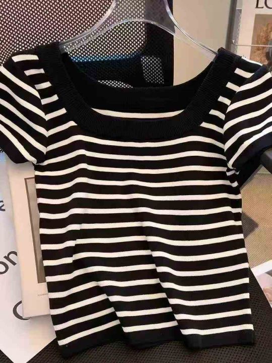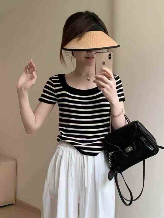 ☕️黑白条纹短袖u领露锁骨针织t恤女夏天薄款高级感正...