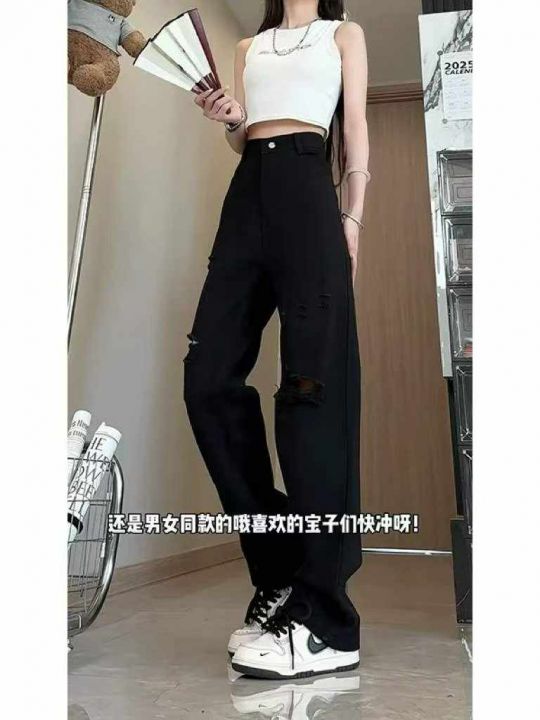 春季新款美式vibe风黑色微胖MM破洞窄版直筒阔腿牛仔裤...