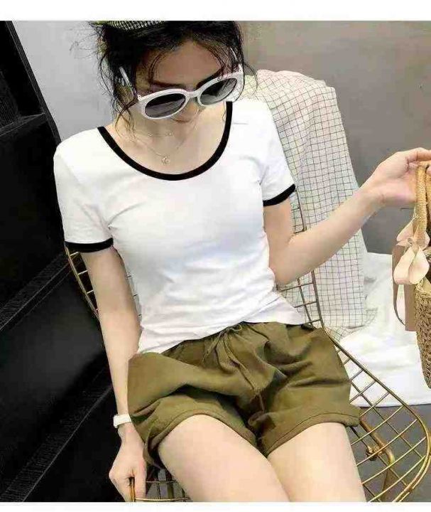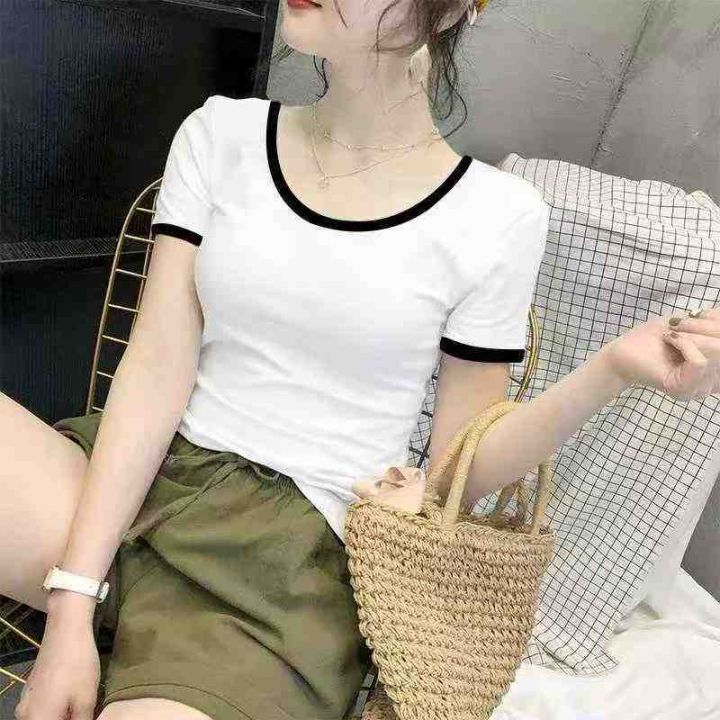 黑白色拼接圆领短袖 85件,全清6.8元,码数:(S到XXL)图片色,十件一个包装,网红拼接撞色短袖T恤女2026夏季新款性感修身圆领百搭上衣