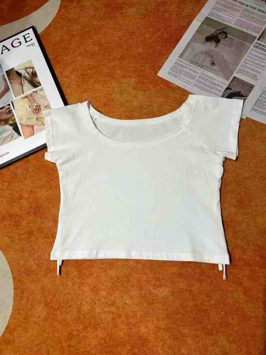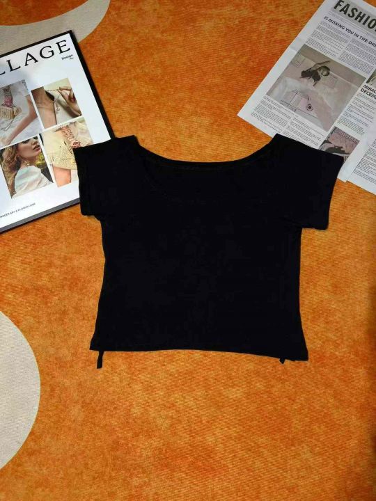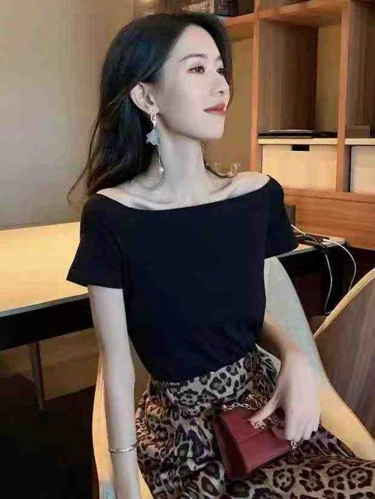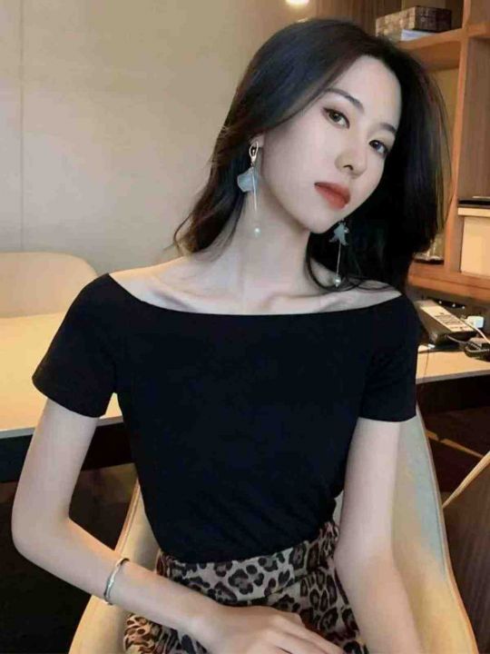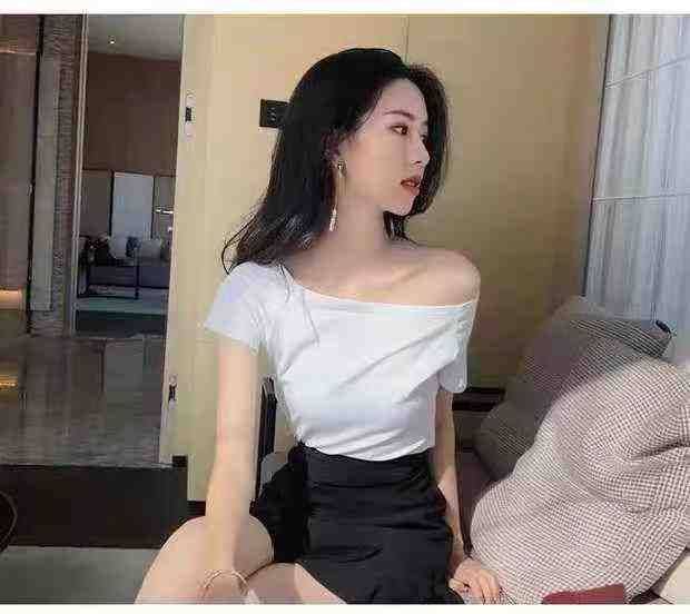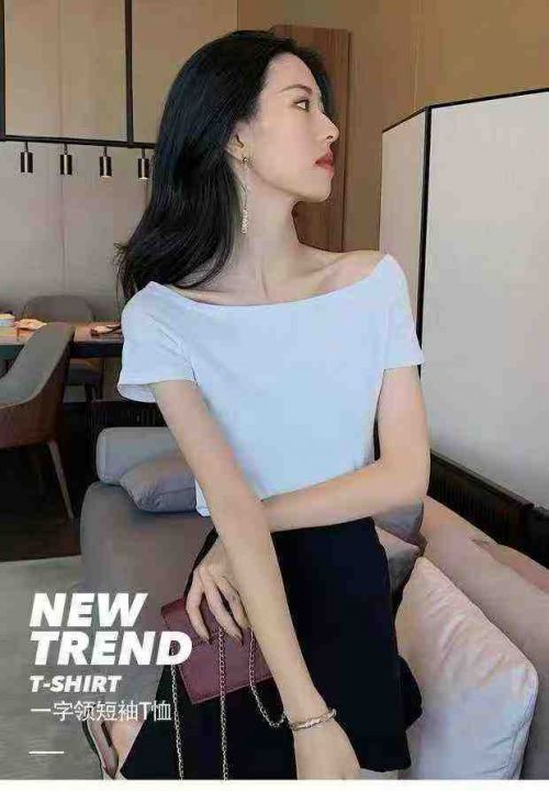 纯棉辣妹一字露肩短袖T桖 89件(黑色79件 白色10件)全清6.8元,正品独立包装,码数:(S到L),短袖t恤女装新款夏季一字肩性感露锁骨露肩修身上衣小众设计感