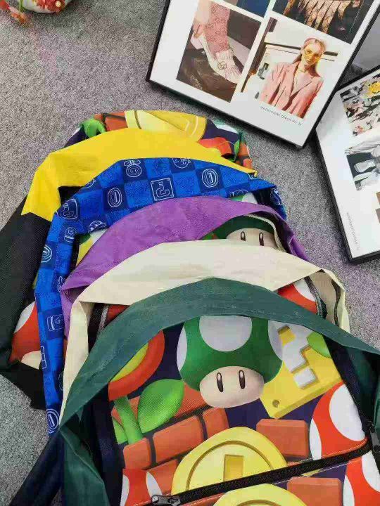数量3700个左右,蘑菇图案书包为主,双袋双拉链,规格45*32,侧面有多色区分,分货➕1