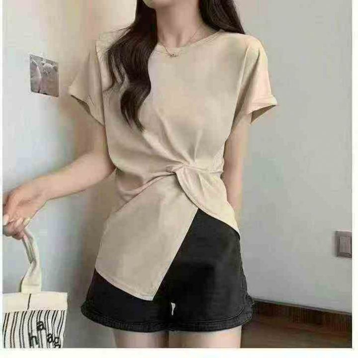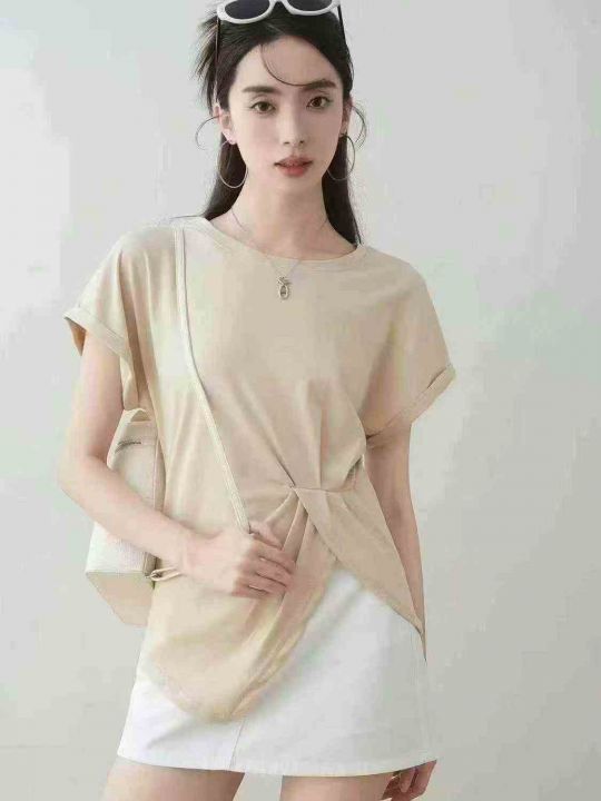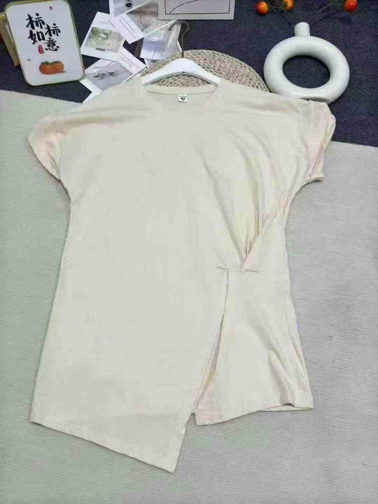 纯棉180-220克大码百搭褶皱收腰短袖T恤女2025夏季新款不规则下摆显瘦上衣打底外穿,数量1540件,码数M-3XL,后领包边,工厂货10件一个包装,全清6.8元,分货7.5元