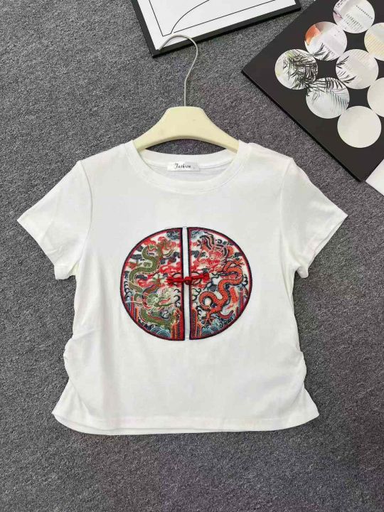 ☕️新中式刺绣独特别致上衣女夏季装大码宽松正肩辣妹T恤280件全清6.8元,码数S到XL,单款白色,纯棉国风工艺款[庆祝][庆祝][庆祝]