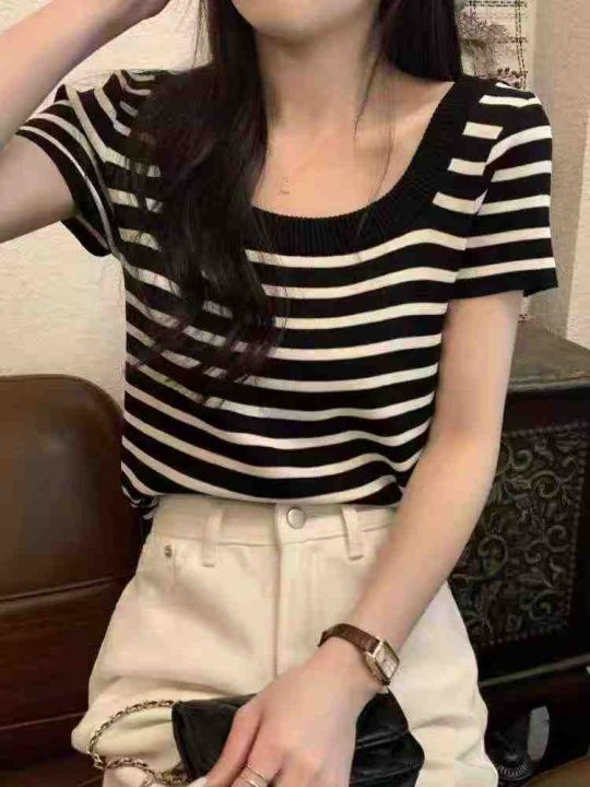 ☕️黑白条纹短袖u领露锁骨针织t恤女夏天薄款高级感正...