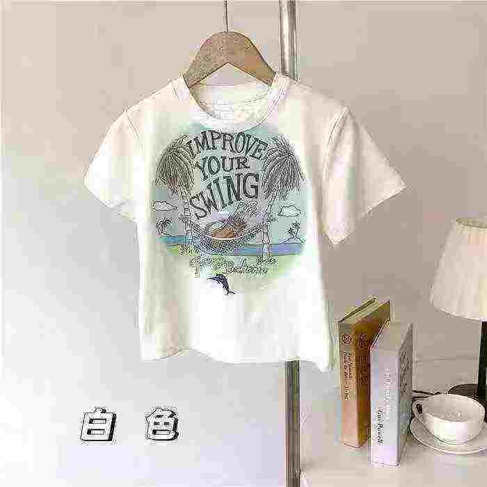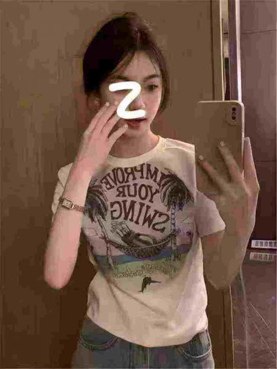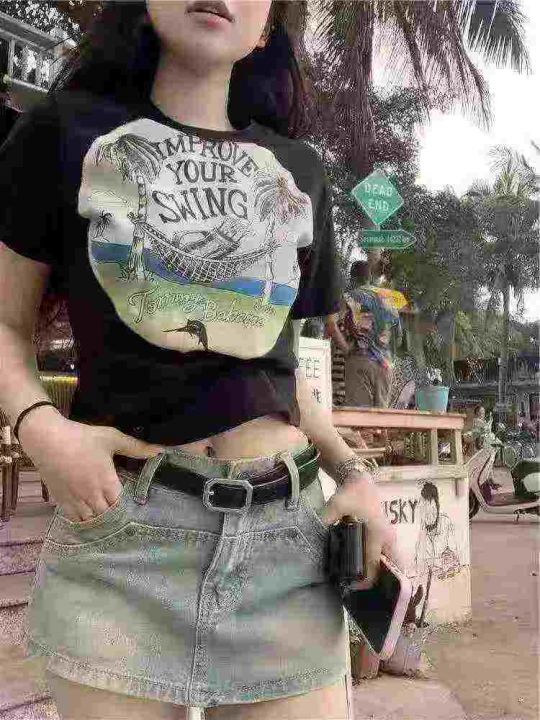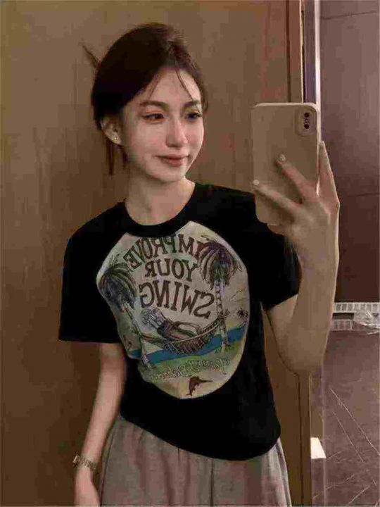 ☕️纯棉设计感复古涂鸦印花短袖T恤显瘦辣妹高腰短款...