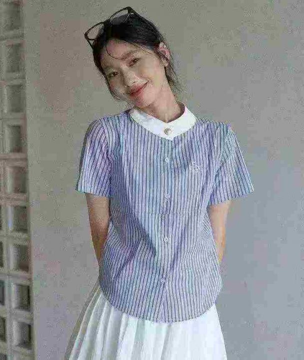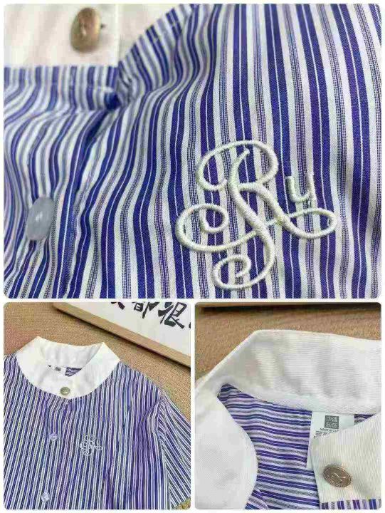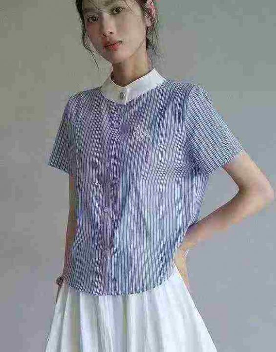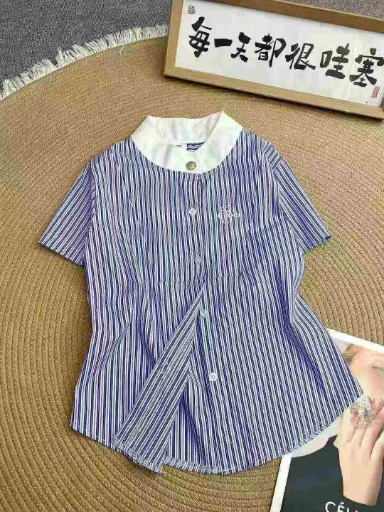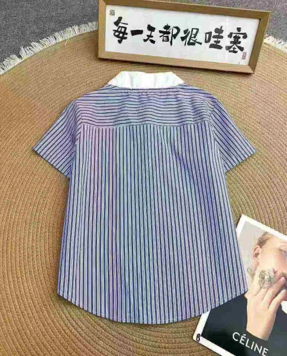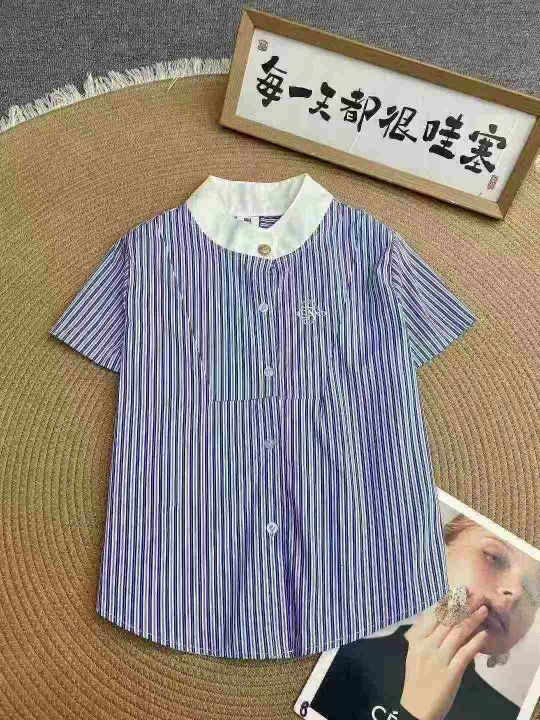 蓝色条纹短袖衬衫164件7.9,撞色拼接,后领包边,图案...