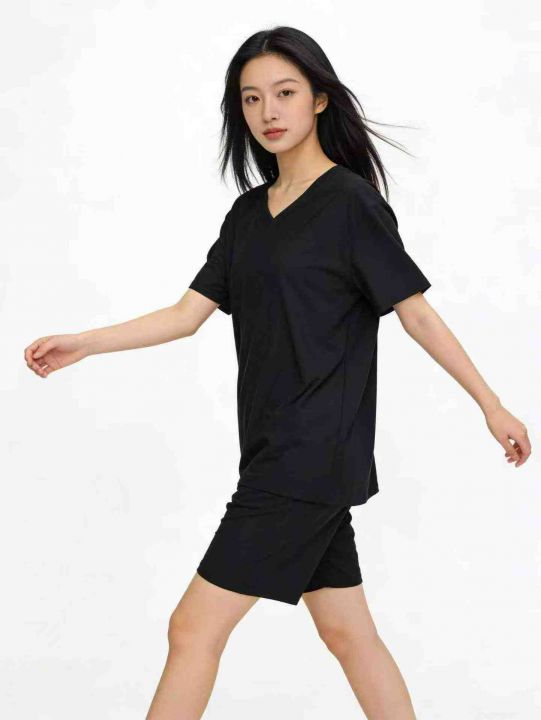电商仓回收163套黑色净版v领显瘦纯色宽松女士短袖短裤套装,码数S-4XL。面料柔软有弹力,独立包装,分货➕0.5