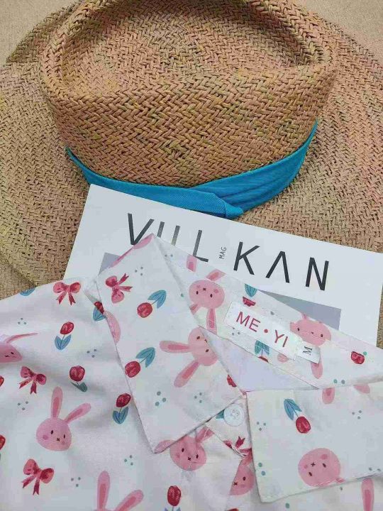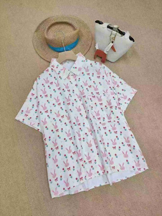 [月亮]:港味甜美兔子满印宽松短袖衬衫