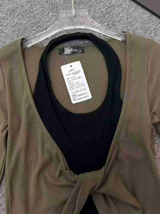 ☕️大整款辣妹长袖4600件全清6.8元 ,分货7.8元,S到XL,单款2色,高弹力,独立包装吊牌,设计感假两件挂脖上衣女早秋辣妹修身显瘦短款露肩撞色长袖T恤