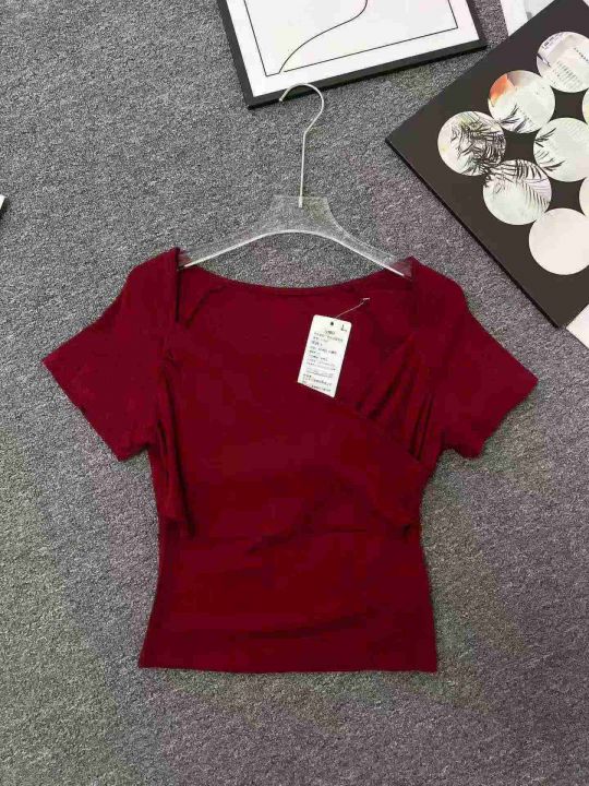 ☕️法式复古交叉v领酒红色短袖T恤女夏季辣妹设计感收腰修身短款上衣230件全清6.8元,码数S到XL,正品独立包装,高弹力纯棉质量[庆祝][庆祝][庆祝]单款图片色