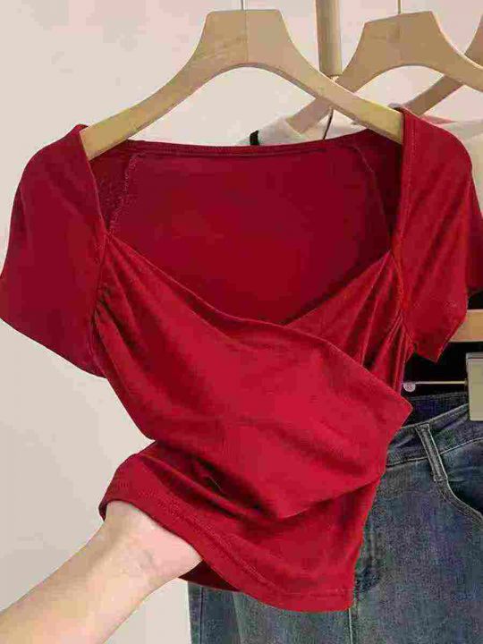 ☕️法式复古交叉v领酒红色短袖T恤女夏季辣妹设计感收...