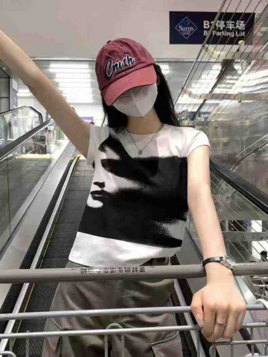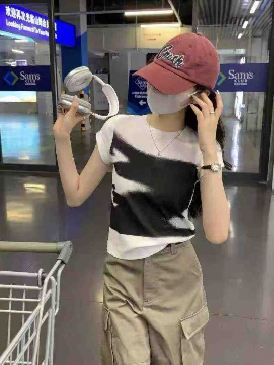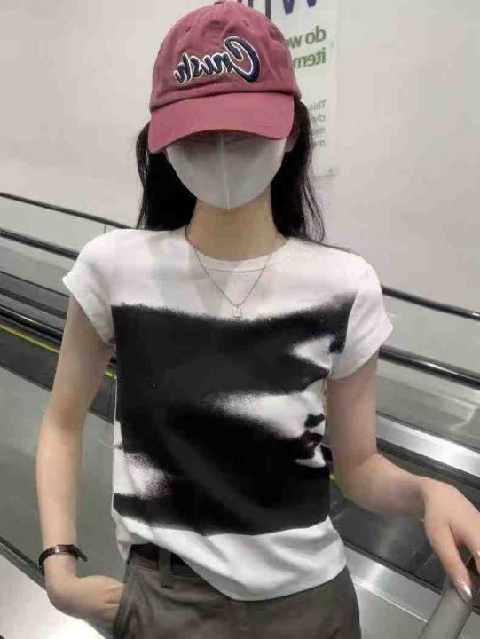 ☕️辣妹撞色白色小飞袖正肩短袖t恤女夏季纯棉修身显...