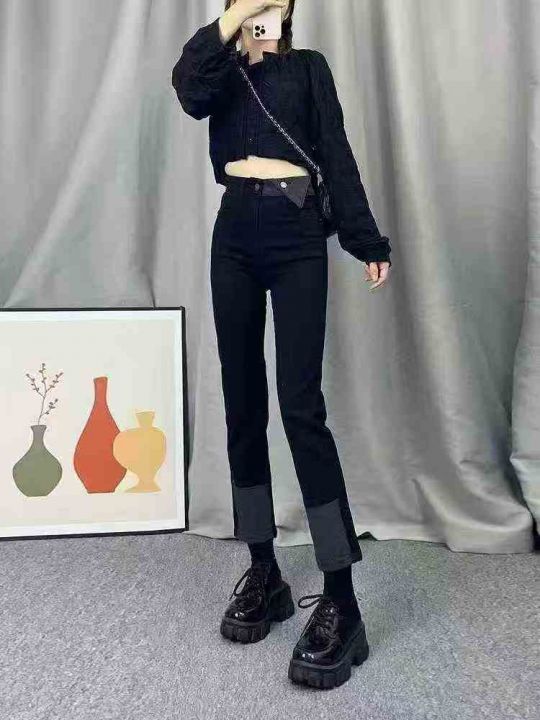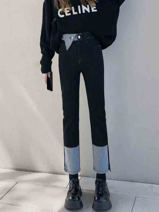 弹力九分直筒牛仔裤女秋季设计感小众烟管阔腿裤500件...