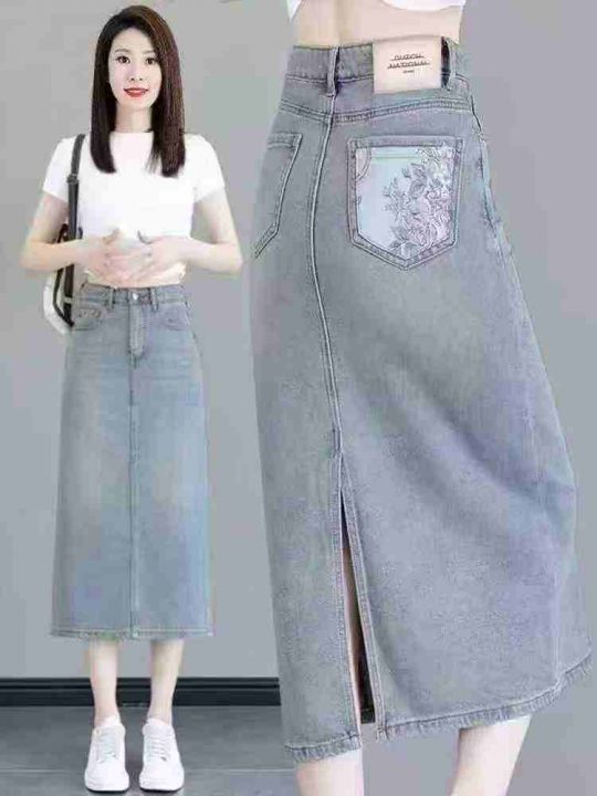贴布绣花牛仔半身裙高腰显瘦后开叉中长裙,单款单色,独立包装带吊牌,s-2X...