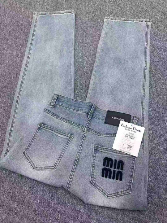 ☕️高弹力烟管牛仔裤女刺绣miu字母图案窄版弹力修身九分裤50条全清11.8元...
