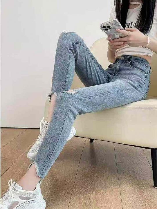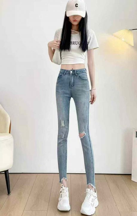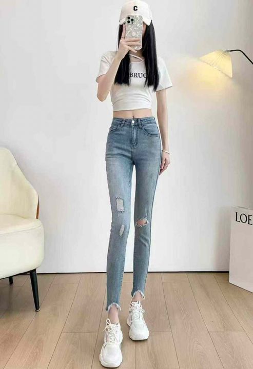 春夏季新款高弹力网红复古洗水棉破洞牛仔小脚裤,独立...