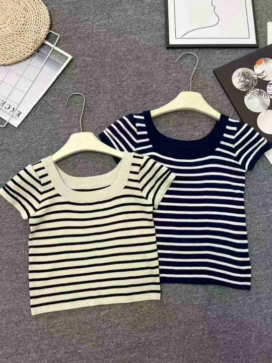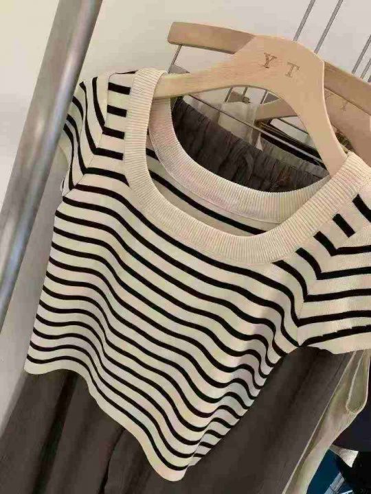 ☕️黑白条纹短袖u领露锁骨针织t恤女夏天薄款高级感正...