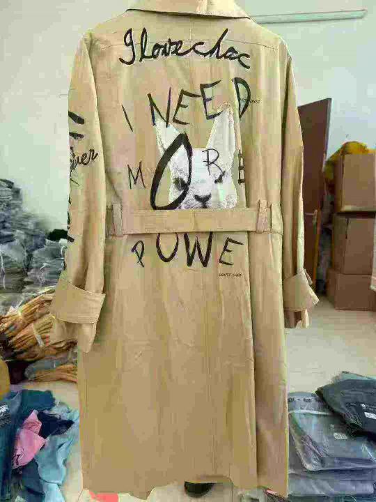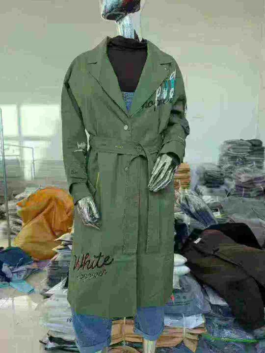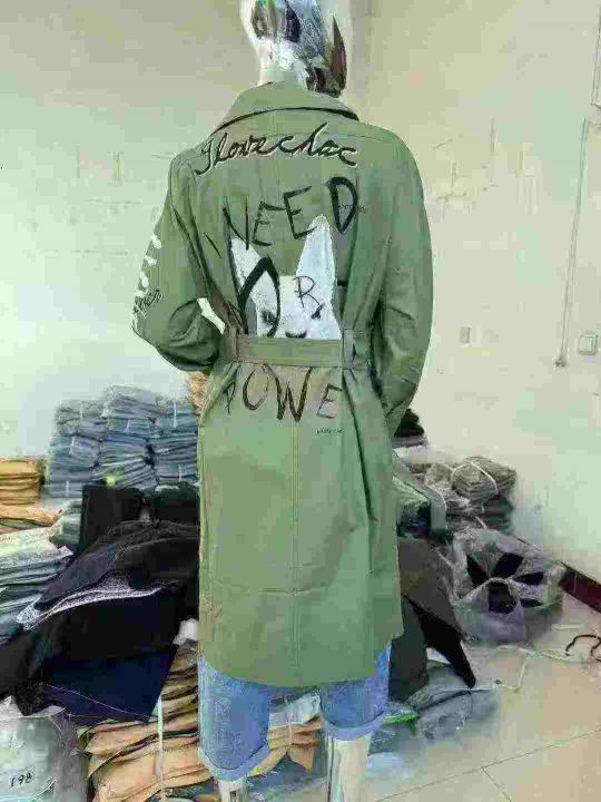 补充视频!大长款风衣,有个172件。全清10元一件,50件起发12元一件,绿色占绝大多数!品质超好。 货号:34268