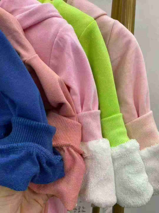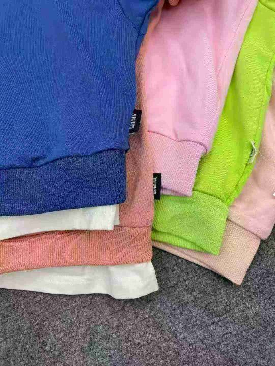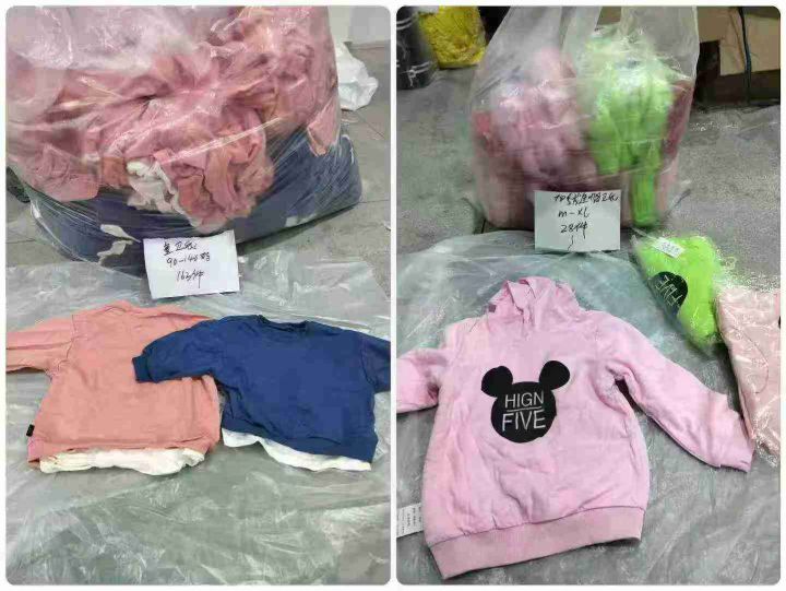 童装休闲卫衣191件,其中圆领假两件款163件,加绒连帽款28件,码数90-140码。部分有独立包装,全清3