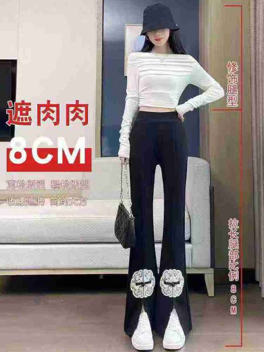 ☕️罗马高弹力新中式开叉微喇裤子女夏季新款阔腿直筒国风喇叭休闲裤170条...